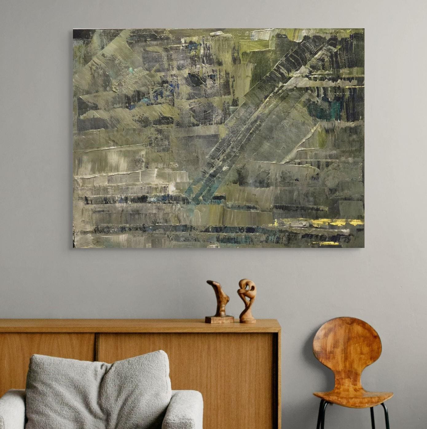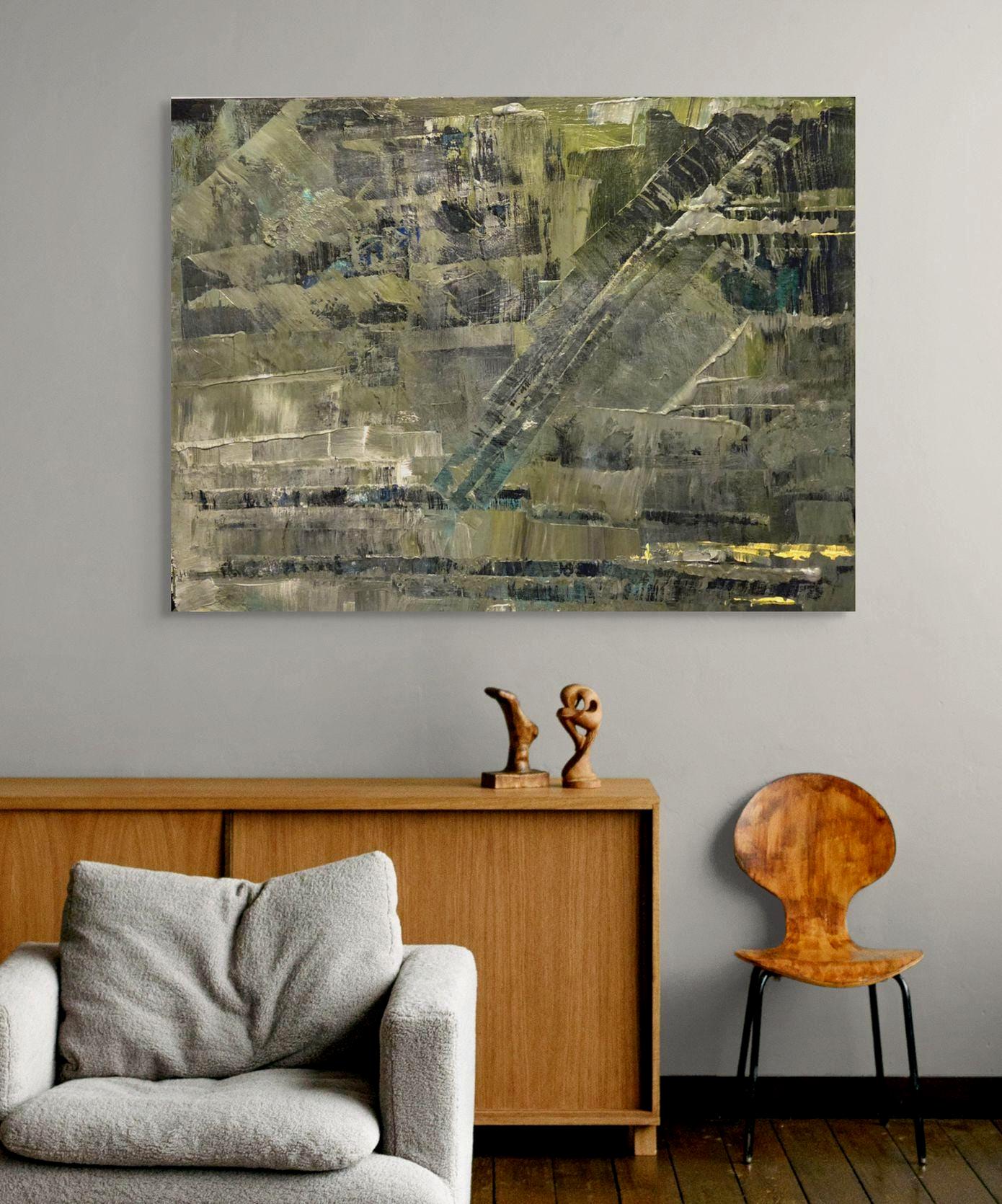 This original, abstract, signed painting is dominated by an earthy toned palette of grey, olive green and subtle shades of blue. It is a highly textured painting which adds much visual interest. The overall impression is an industrial , perhaps deconstructed structure.