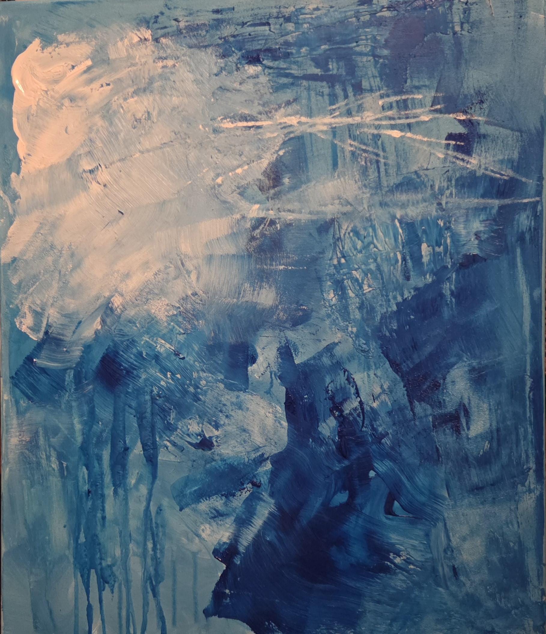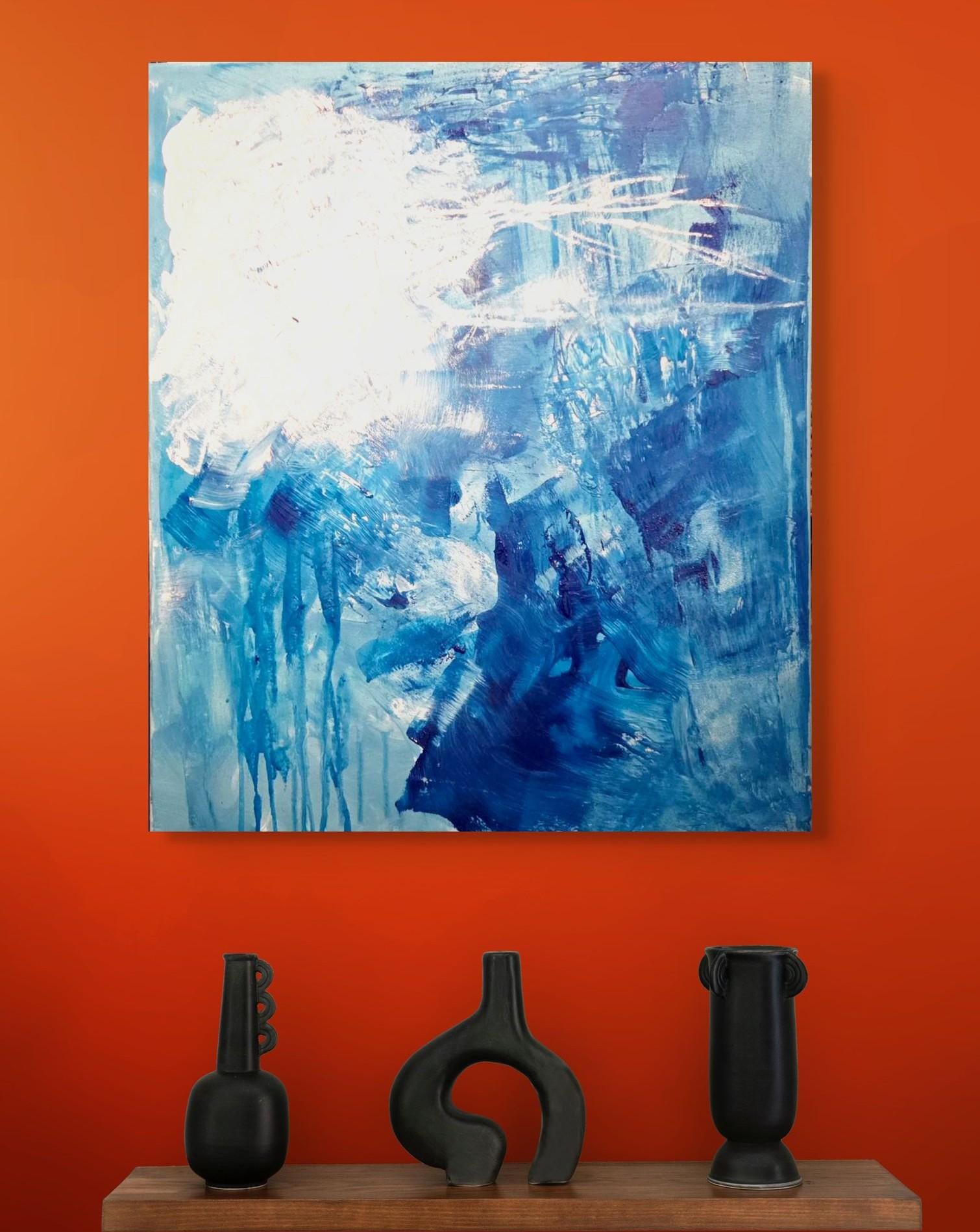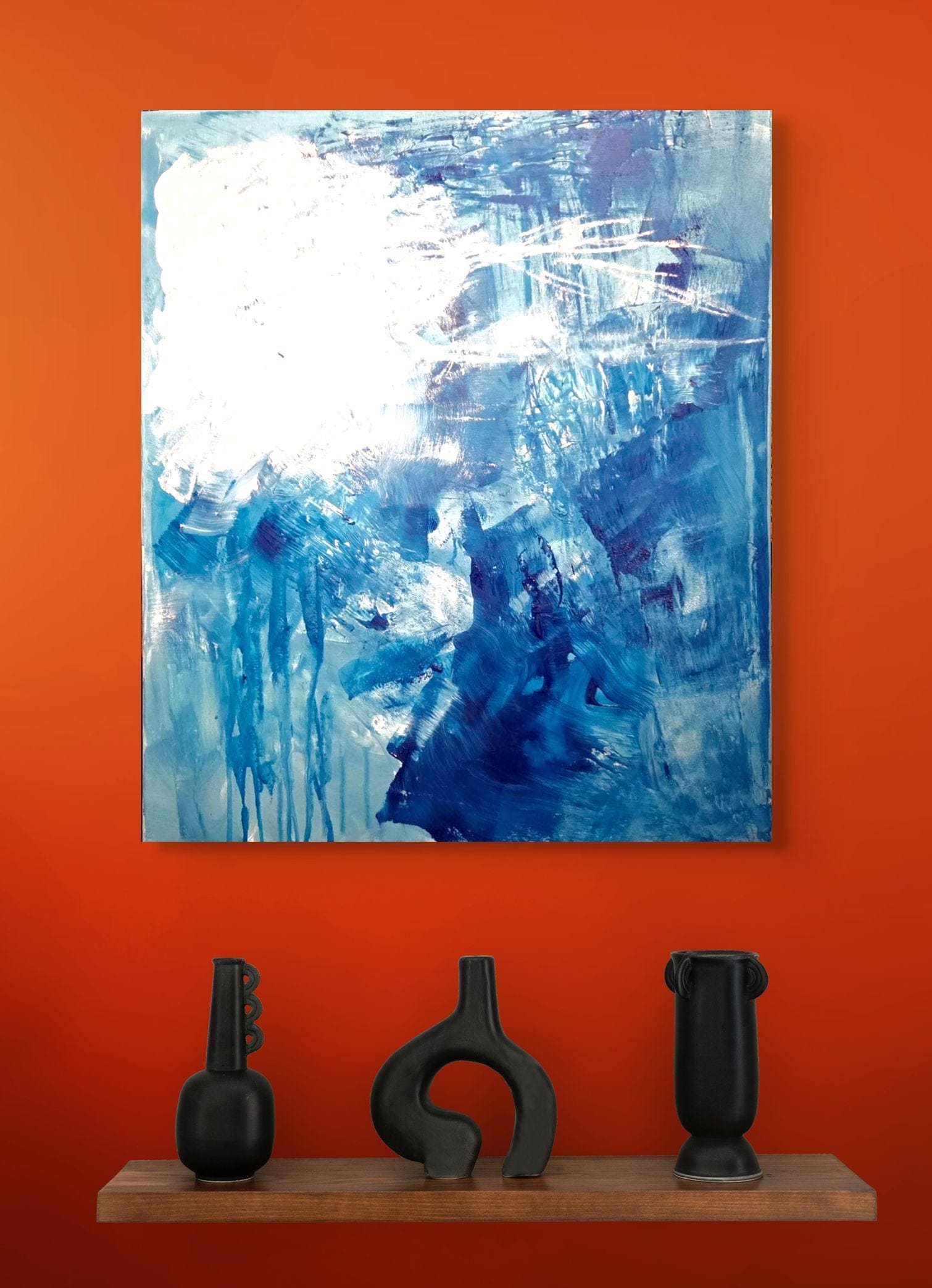 Original abstract painting with various shades of blue contrasted with shades of white. dynamic painting 20x24 suitable for any type of decor. Strategically placed will become the focal point og your room!!