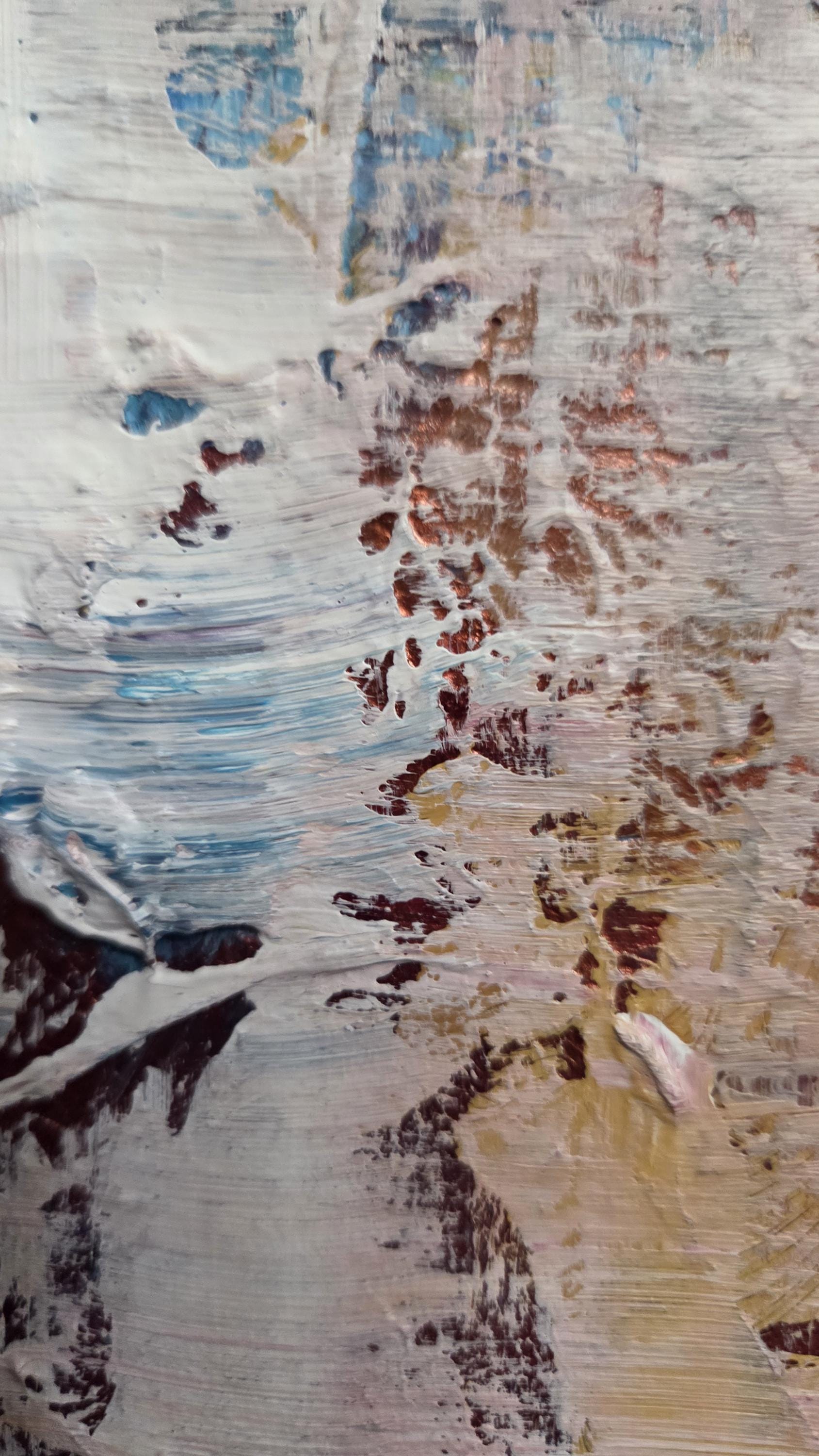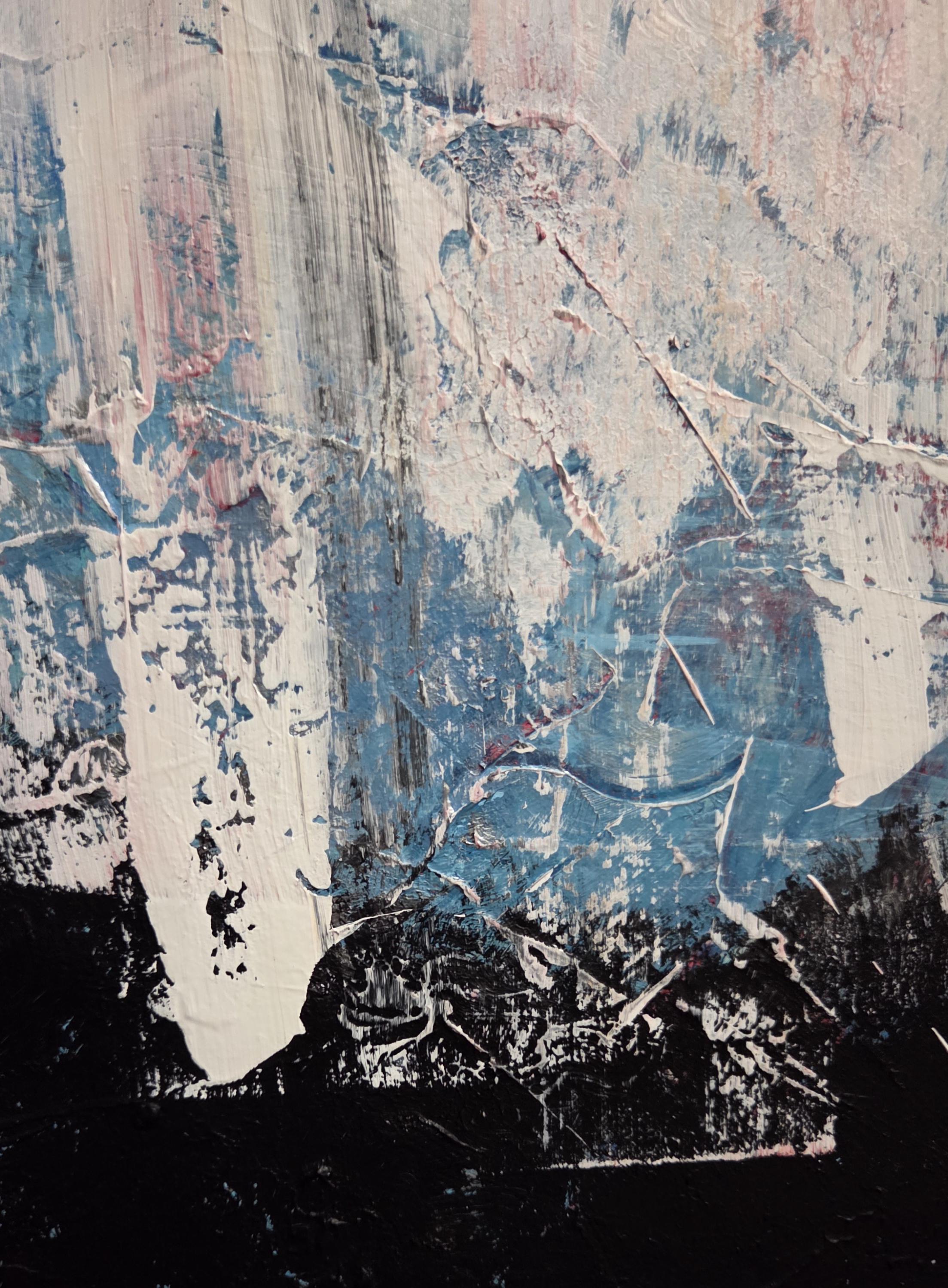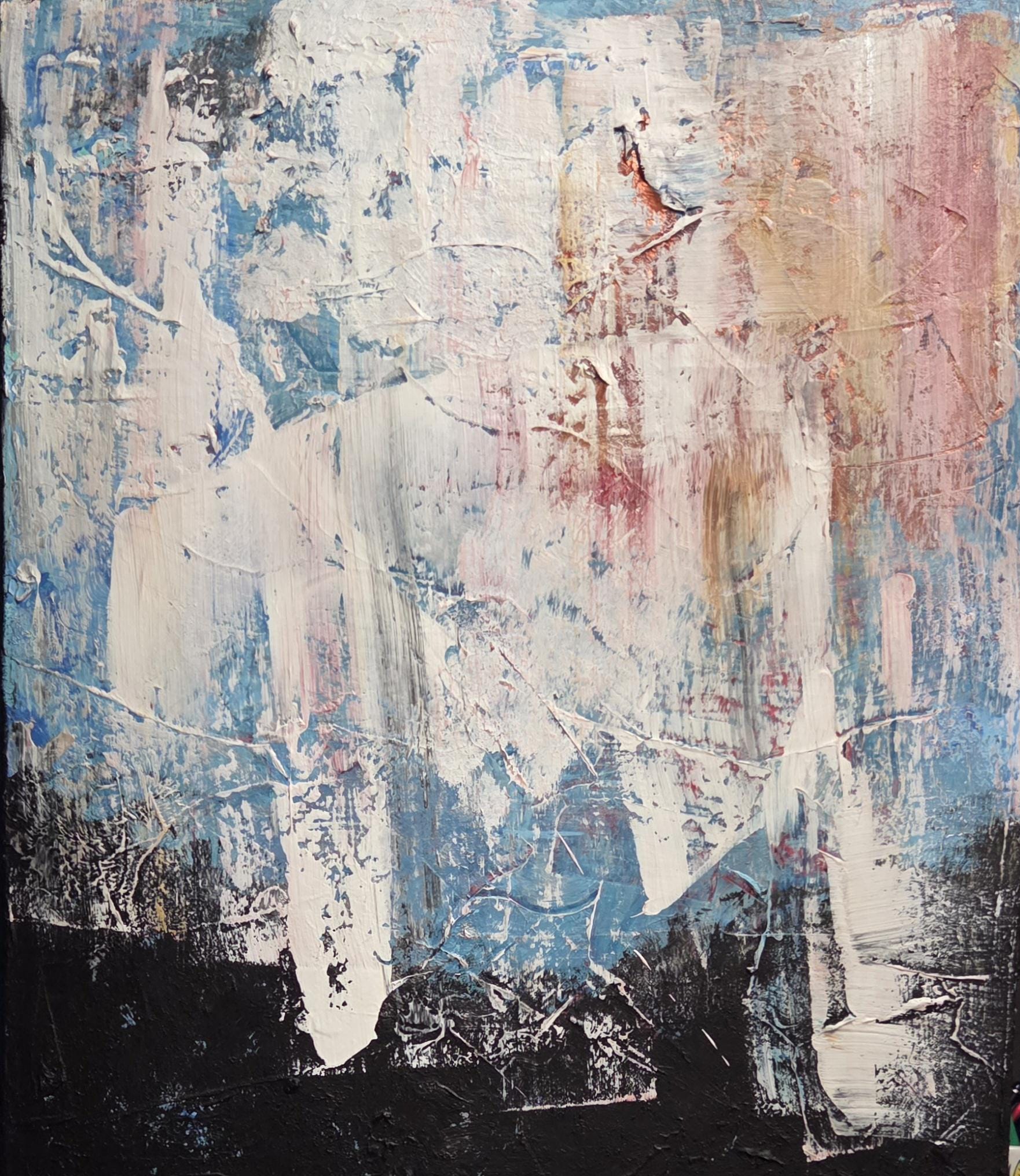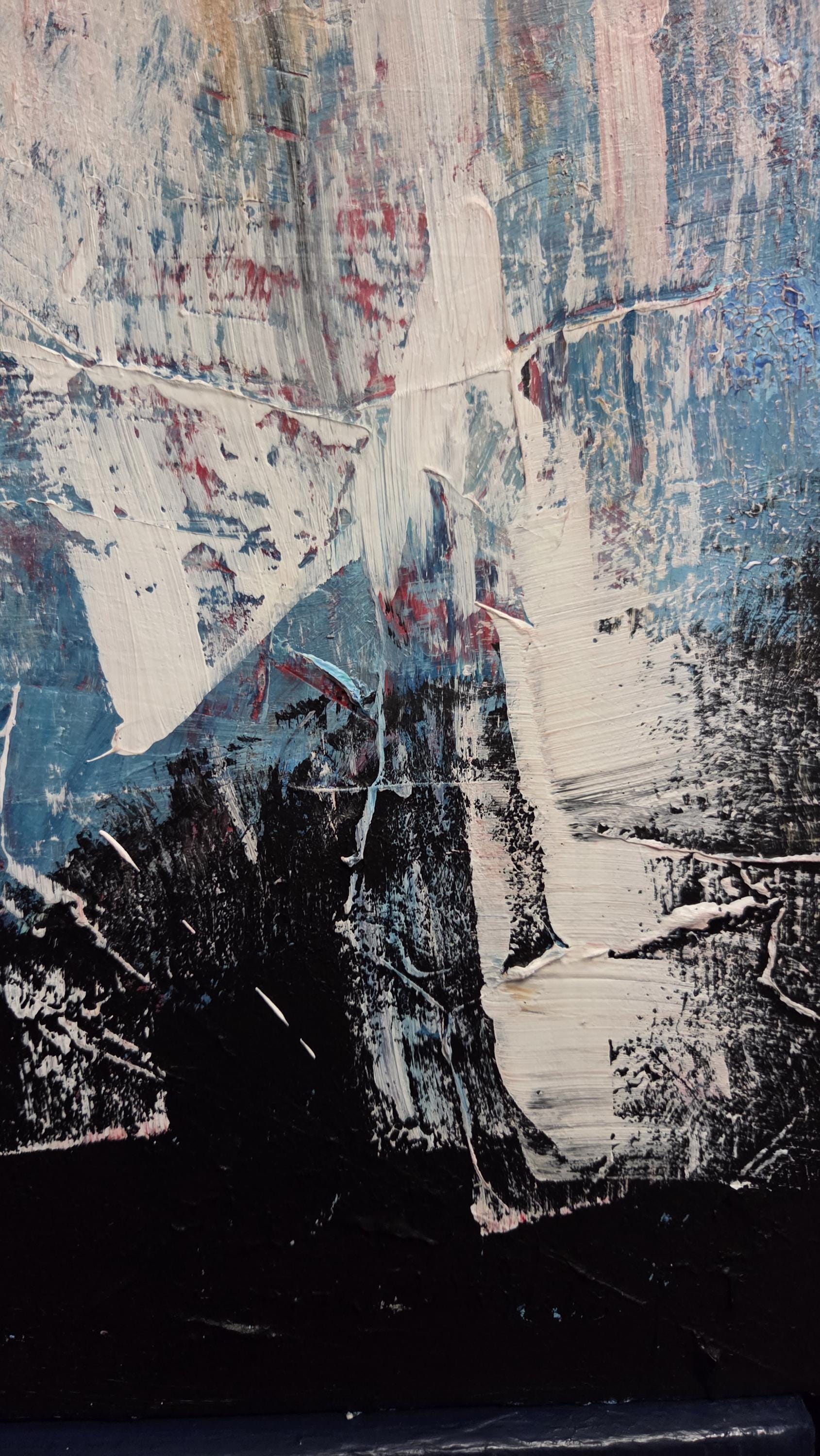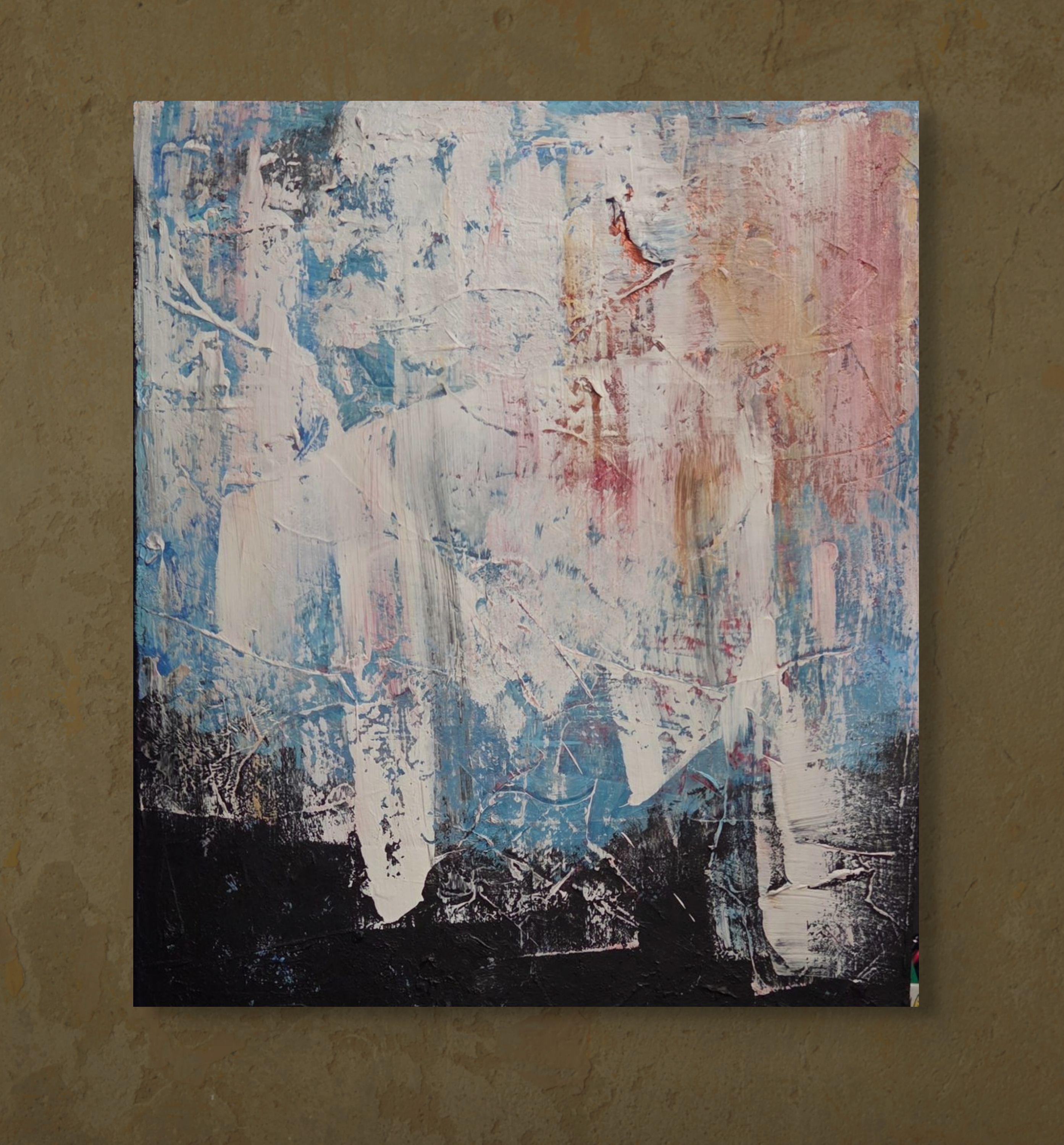 Original abstract 20x24" muted shades of blue white salmon color. grounded by base of black. Hevily textured for visual interest.