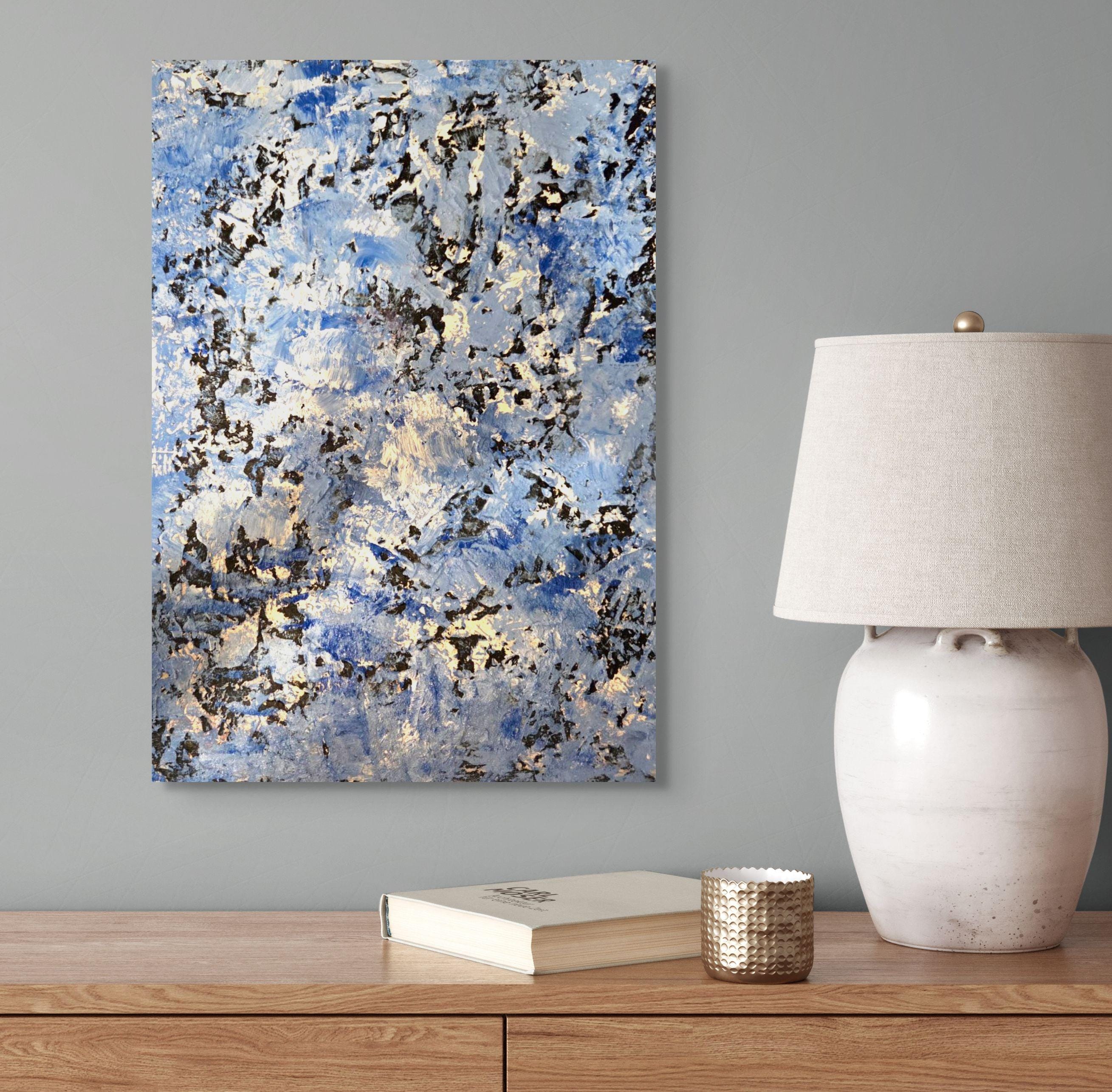 Very textured, "impasto" effect. Subtle shades of blue with black and white. this 20x24 conversation piece is a prfect accent with any stle of decor.
